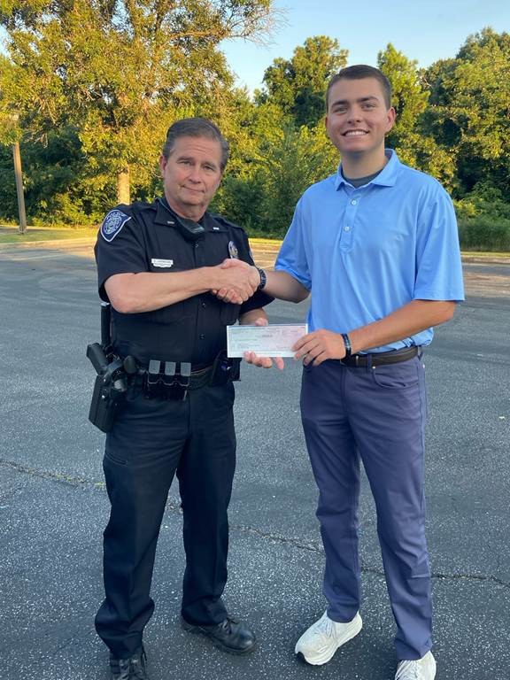 Steve Johnson President of the Jefferson/Shelby county chapter of the Alabama Police Benevolent Association presents a check to Cade Caufield