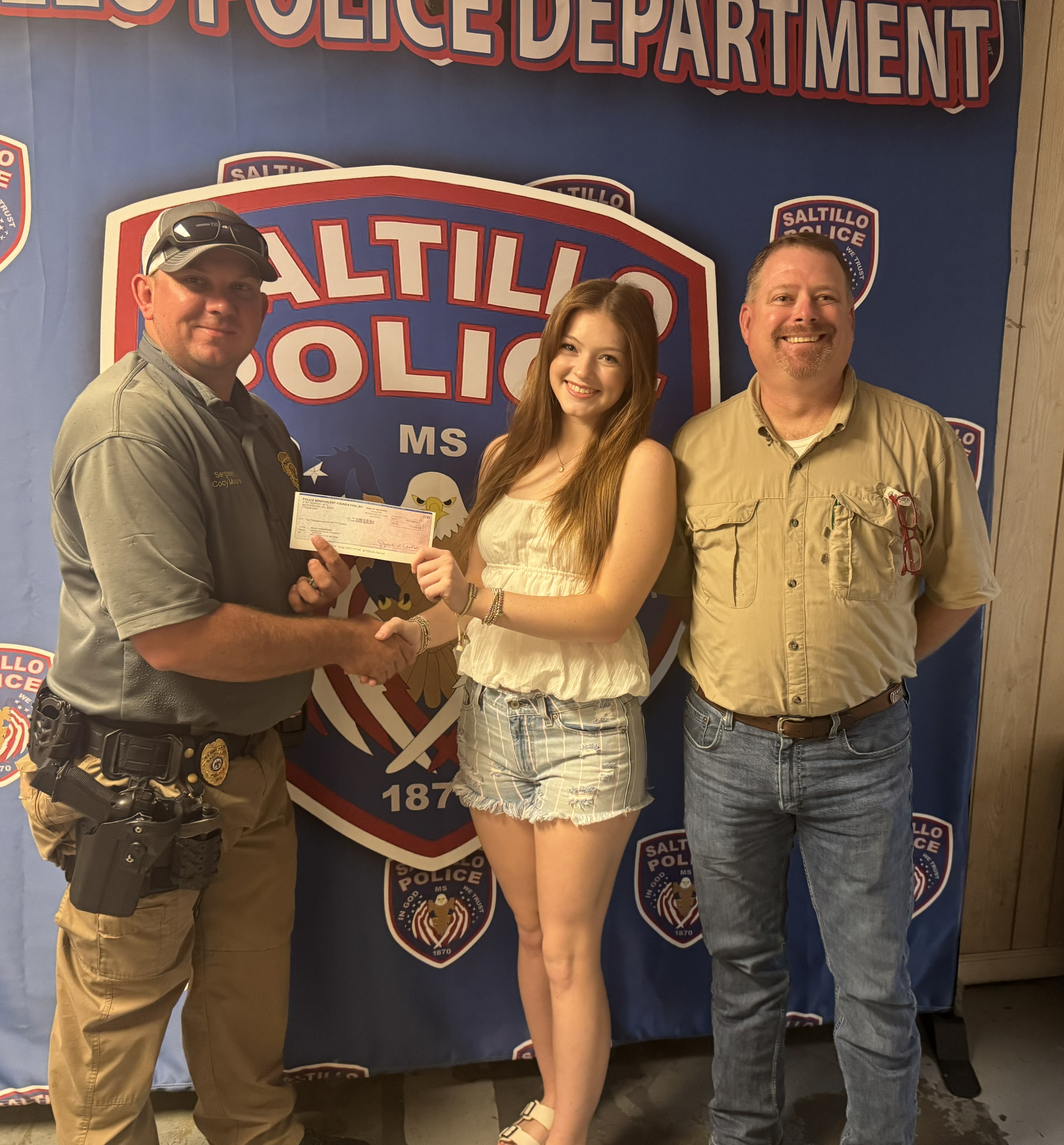 Cody Moore (l) of the North East Chapter of the Mississippi Police Benevolent Association presents a check to Riley Anderson. With them is her dad, Rob. Riley is from New Albany, Miss., and attends Mississippi State University. She has chosen interior design as her major.