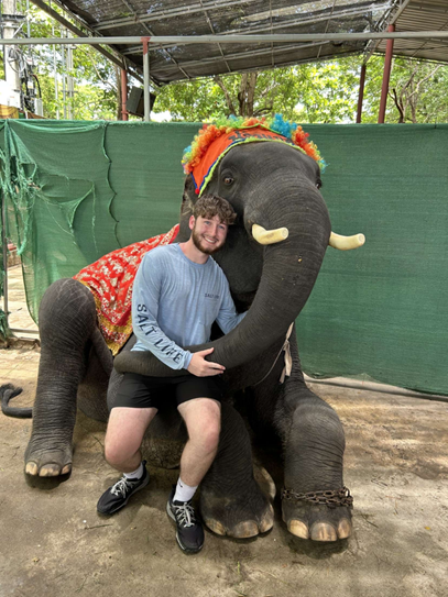 Caleb Cockrell with an elephant on a mission trip in Bangkok, Thailand