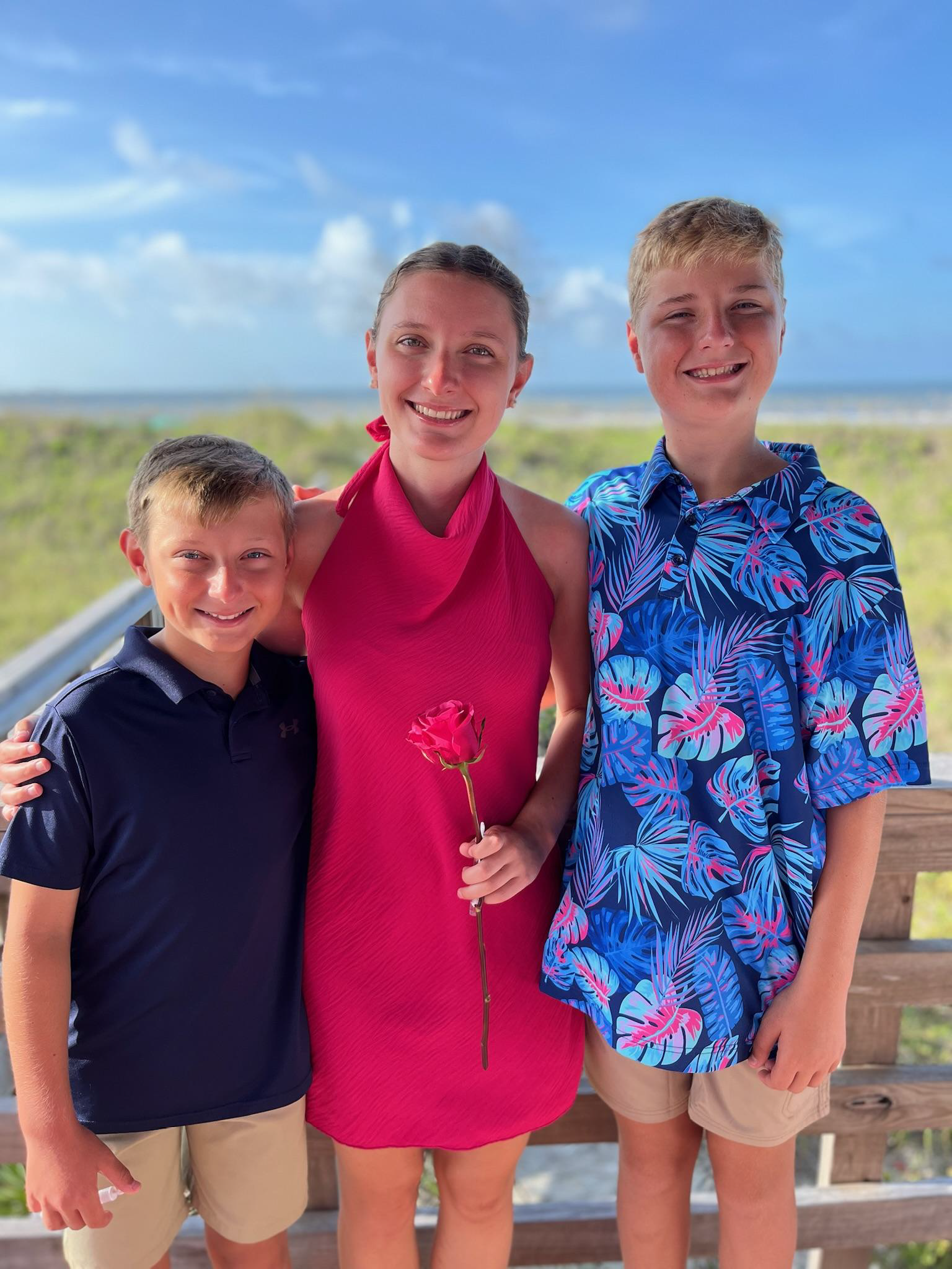 Hailey and her brothers taking a family photo at the beach.